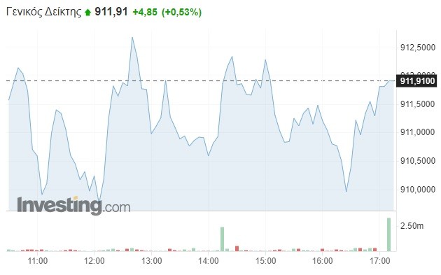 Πιο συγκεκριμένα, ο Γενικός Δείκτης σημείωσε ήπια αύξηση κατά 0,53% και διαμορφώθηκε στις 911,91 μονάδες, κερδίζοντας περίπου πέντε μονάδες σε σχέση με το κλείσιμο της Δευτέρας (907,06 μονάδες). Το τόξο των ημερήσιων διακυμάνσεων καθορίστηκε σε τρεις μονάδες (από 909,70 έως 912,82 μονάδες), με τον τζίρο των συναλλαγών να κυμαίνεται στα 59,5 εκατομμύρια ευρώ.
