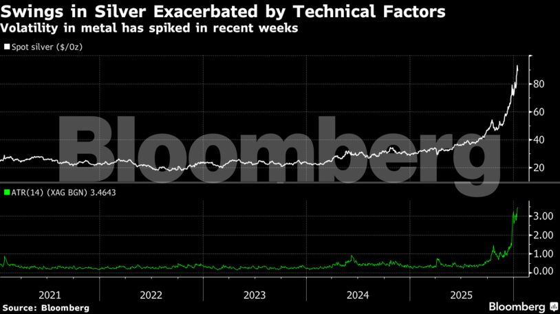 Το ασήμι εμφανίζει έντονες διακυμάνσεις τις τελευταίες εβδομάδες, με τον δείκτη 14 ημερών της εκθετικής μέσης πραγματικής διακύμανσης –μέτρο μεταβλητότητας– να εκτοξεύεται, εξέλιξη που αποδίδεται κυρίως σε τεχνικούς και όχι θεμελιώδεις λόγους.