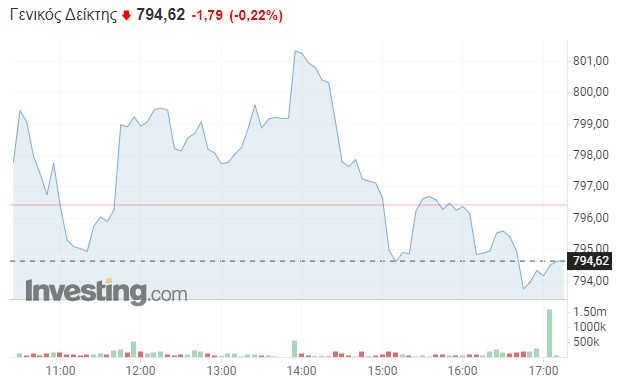 Πιο συγκεκριμένα, έπειτα από συνεχείς εναλλαγές προσήμων, ο Γενικός Δείκτης σημείωσε οριακή πτώση κατά 0,22% και διαμορφώθηκε στις 794,62 μονάδες, χάνοντας σχεδόν δύο μονάδες σε σχέση με το κλείσιμο της Πέμπτης (796,41 μονάδες). Το τόξο των ημερήσιων διακυμάνσεων καθορίστηκε σε οκτώ μονάδες (από 793,54 έως 801,37 μονάδες), με τον τζίρο να υπερβαίνει μετά βίας τα 34,5 εκατομμύρια ευρώ.