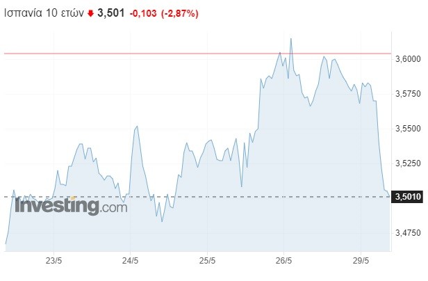 Αισθητή αποκλιμάκωση εμφανίζει το κόστος δανεισμού της Ισπανίας, μετά την ήττα του σοσιαλιστικού κόμματος στις περιφερειακές εκλογές της Κυριακής, η οποία ανάγκασε τον πρωθυπουργό, Πέδρο Σάντσεθ, να προκηρύξει πρόωρες βουλευτικές κάλπες στις 23 Ιουλίου.