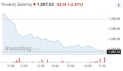 Πιο αναλυτικά, ο Γενικός Δείκτης σημείωσε μεγάλη πτώση κατά 2,47% και διαμορφώθηκε στις 1.267,33 μονάδες, χάνοντας τουλάχιστον 32 μονάδες σε σχέση με το κλείσιμο της Παρασκευής (1.299,47 μονάδες). Το τόξο των ημερήσιων διακυμάνσεων καθορίστηκε σε 38 μονάδες (από 1.267,33 έως 1.305,35 μονάδες), με τον τζίρο των συναλλαγών να κυμαίνεται στα 84,6 εκατ. ευρώ.