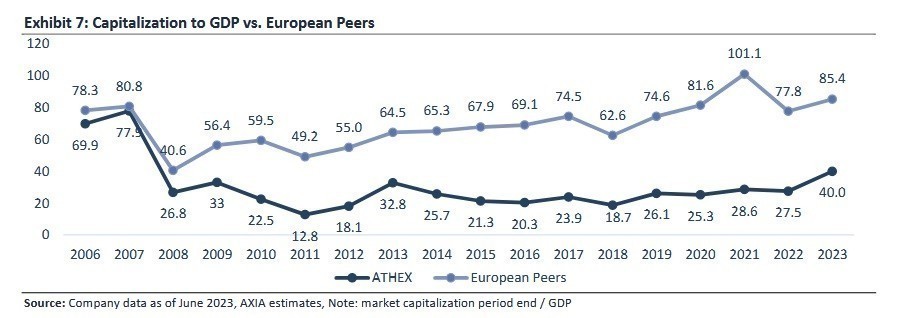 Όπως υπογραμμίζουν οι αναλυτές, τα ισχυρά θεμελιώδη μακροοικονομικά και μικροοικονομικά στοιχεία της ελληνικής αγοράς θα επιτρέψουν στο Χρηματιστήριο Αθηνών να συγκλίνει προς τον μέσο όρο της γενικότερης Ευρωπαϊκής Ένωσης σε ό,τι αφορά την κεφαλαιοποίηση της αγοράς ως ποσοστό του ΑΕΠ. Σύμφωνα με τους αναλυτές, το ποσοστό αυτό αναμένεται να αυξηθεί κατά 15% έως το 2024, αυξάνοντας το συνολικό market cap του Χ.Α. κατά 45%.
