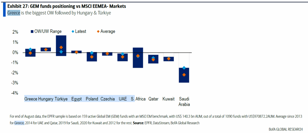 Σύμφωνα με τη Bank of America, η Ελλάδα είναι η μεγαλύτερη υπέρβαρη αγορά (overweight) της περιοχής, ακολουθούμενη από την Ουγγαρία και την Τουρκία. Η υπερέκθεση των διεθνών κεφαλαίων έναντι του δείκτη MSCI EM υπολογίζεται στο +1,5%, με τη συμμετοχή της χώρας κοντά στο 0,7%.