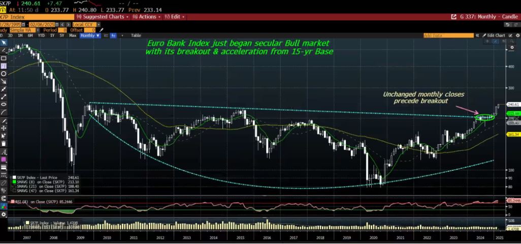 Δεύτερον, τα τεχνικά στοιχεία: Εδώ ο δείκτης Stoxx 600 πραγματικά λάμπει. Σε αντίθεση με τον δείκτη KBW, ο οποίος είναι αμετάβλητος από το υψηλό του Ιανουαρίου 2022, ο δείκτης Stoxx 600 επιταχύνει από μια τεράστια βάση 15 ετών. Αυτό σημαίνει ότι έχει μόλις ξεκινήσει μια μακροπρόθεσμη ανοδική αγορά. Το παρακάτω μηνιαίο διάγραμμα απεικονίζει τα ισχυρά τεχνικά διαπιστευτήρια των ευρωπαϊκών τραπεζών.