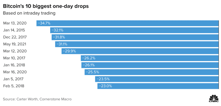 Για παράδειγμα, έαν ένας επενδυτής bitcoin που αγόρασε όταν η απόδοση του κρυπτονομίσματος βρισκόταν στα ύψη στις αρχές Απριλίου (περίπου στα 65.000 δολάρια) και πουλούσε όταν αυτό διαπραγματευόταν χαμηλά (σχεδόν στα 30.000 δολάρια) θα είχε χάσει το 54% των κερδών του.