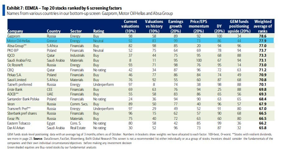 Κορυφαία επιλογή για τη Bofa είναι η αγορά της Ρωσίας που τοποθετείται στην πρώτη θέση με ισχυρή αύξηση των κερδών, ευνοϊκές αποτιμήσεις και υψηλά μερίσματα. Η Τουρκία υποχώρησε στη δεύτερη θέση λόγω της επιδείνωσης της δυναμικής και της ασθενέστερης αύξησης των κερδών. Η Σαουδική Αραβία και η Νότια Αφρική ισοβαθμούν στη συνολική κατάταξη. Η Ν. Αφρική επωφελείται από τις ευνοϊκές αποτιμήσεις, την τοποθέτηση και τα μερίσματα, ενώ η Σαουδική Αραβία παρουσιάζει συγκριτικά υψηλά κέρδη.