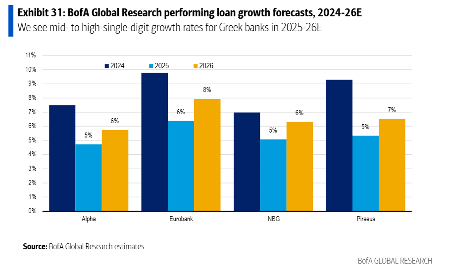Η ισχυρή αύξηση των δανείων εξακολουθεί να αποτελεί το βασικό στοιχείο διαφοροποίησης σε σχέση με τις ευρωπαϊκές τράπεζες. Η BofA βλέπει 10% αύξηση σε ετήσια βάση το 2024 στην Ελλάδα έναντι συγκρατημένης ανάπτυξης στην Ευρώπη, χάρη στα δάνεια του μηχανισμού RRF και την ανάκαμψη των έργων μεγάλης κλίμακας. Οι τράπεζες δεν έχουν ακόμη αλλάξει τους στόχους ανάπτυξης για το 2025/2026.
