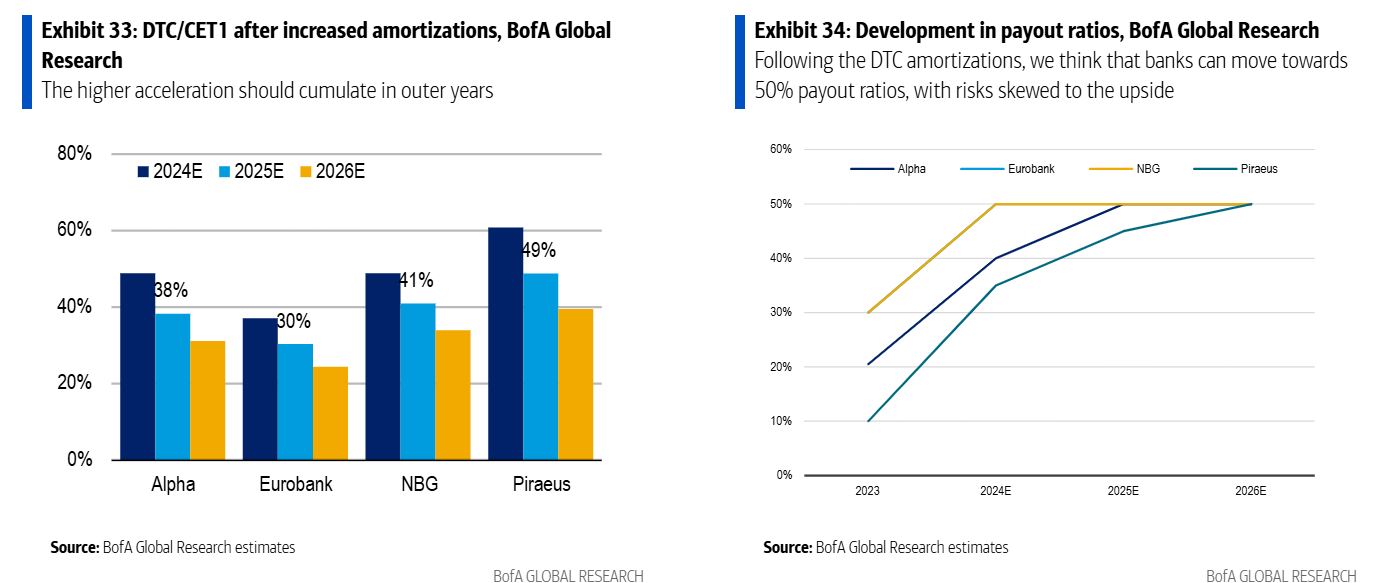 Μετά τις ανακοινώσεις για τα σχέδια επιτάχυνσης της απόσβεσης των αναβαλλόμενων φορολογικών πιστώσεων (DTC) το 2024, ο αναλυτής της BofA αύξησε τις προσδοκίες του για τα πληρωτέα κέρδη για το 2025/2026. Η ελάφρυνση του DTC ως προς τα εποπτικά κεφάλαια (CET1) εξακολουθεί να είναι μικρή βραχυπρόθεσμα, οπότε θέτει ανώτατο όριο το 50% στα επίπεδα πληρωμών μέχρι να υπάρξει μεγαλύτερη κανονιστική βεβαιότητα. Ωστόσο, με την ποιότητα του κεφαλαίου να βελτιώνεται σταδιακά, θεωρεί ότι οι κίνδυνοι για υψηλότερες πληρωμές είναι στραμμένοι προς τα πάνω. Εξακολουθούν να μην πιστεύουν ότι οι επαναγορές κεφαλαίου είναι ακόμη δυνατές, δηλαδή, μείωση των αποθεμάτων CET1, αλλά οι ετήσιες πληρωμές κερδών θα πρέπει να μοιραστούν μεταξύ μερισμάτων και επαναγορών, οδηγώντας σε αύξηση των κερδών ανά μετοχή.