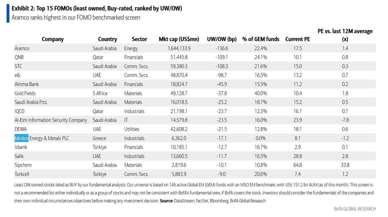 Πέρα από τα «γεμάτα» trades, ξεχωρίζουν και οι μετοχές όπου οι επενδυτές δεν έχουν ακόμη τοποθετηθεί επαρκώς. Η Metlen εμφανίζεται μεταξύ των λιγότερο κατεχόμενων τίτλων με θετική αξιολόγηση (fear of missing out – FOMO), δηλαδή μετοχή που προτείνεται αλλά δεν βρίσκεται ακόμη στα χαρτοφυλάκια των funds.
