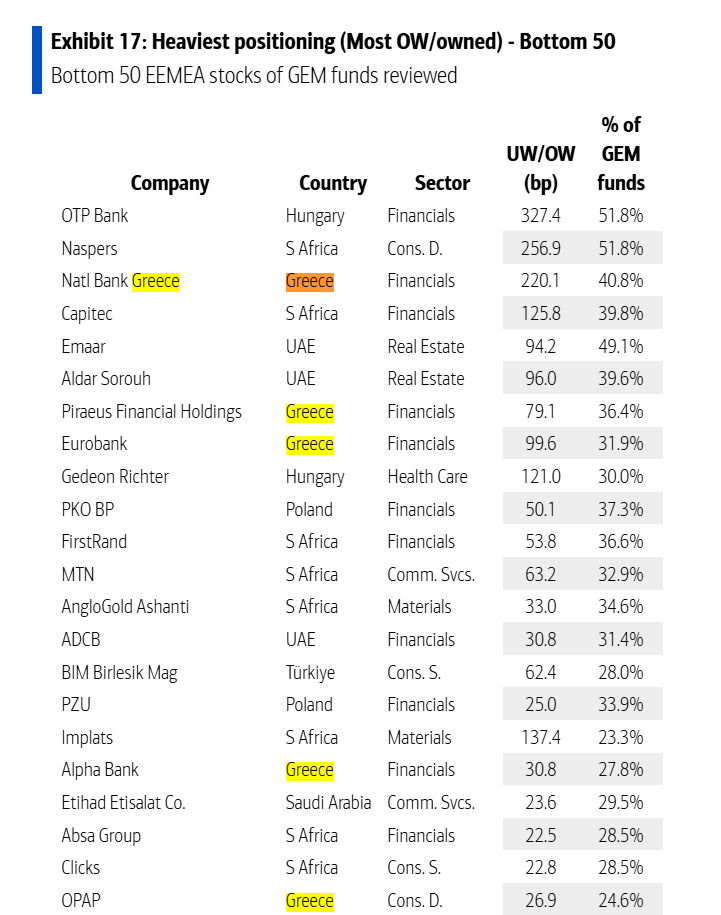 Στην κατανομή κεφαλαίων, η Ελλάδα εμφανίζεται ως η μεγαλύτερη overweight αγορά μεταξύ των χωρών της περιοχής, μπροστά από Ουγγαρία και Τουρκία. Αυτό πρακτικά σημαίνει ότι τα διεθνή χαρτοφυλάκια κατέχουν ελληνικές μετοχές σημαντικά πάνω από τη στάθμισή τους στους δείκτες αναδυόμενων αγορών, ένδειξη ότι η χώρα αντιμετωπίζεται πλέον ως βασική επενδυτική έκθεση και όχι ως τακτική τοποθέτηση. Οι τοποθετήσεις συγκεντρώνονται κυρίως στις τράπεζες και σε λίγα μεγάλα blue chips όπως Εθνική Τράπεζα, Eurobank, Τράπεζα Πειραιώς, Alpha Bank, ΟΠΑΠ, ΟΤΕ και Jumbo. Οι τέσσερις συστημικές τράπεζες συγκαταλέγονται στους τίτλους με τη μεγαλύτερη συμμετοχή ενεργών funds στην περιοχή, στοιχείο που δείχνει ότι το ελληνικό story παίζεται κυρίως μέσω της κερδοφορίας και της κεφαλαιακής απόδοσης του τραπεζικού κλάδου.