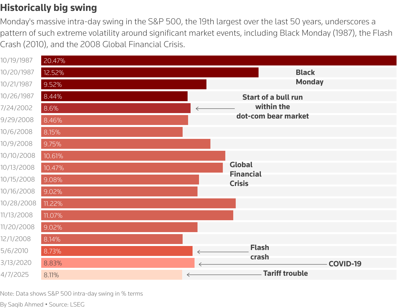 Η συνδυασμένη πτώση του S&P 500 κατά 10,5% την περασμένη Πέμπτη και την Παρασκευή ήταν η τέταρτη μεγαλύτερη διήμερη πτώση του δείκτη από το 1950, σύμφωνα με τον Κιθ Λέρνερ, της Truist Advisory Services. Οι μεγαλύτερες διήμερες πτώσεις σημειώθηκαν τον Μάρτιο του 2020, όταν χτύπησε η πανδημία, τον Νοέμβριο του 2008, κατά τη διάρκεια της χρηματοπιστωτικής κρίσης και το 1987, το διήμερο που περιλάμβανε τη «Μαύρη Δευτέρα» της Wall Street.