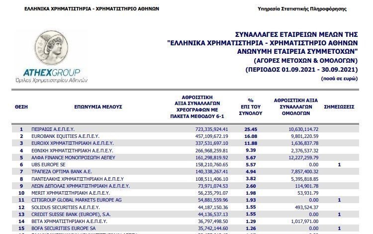 Την πρώτη θέση στην κατάταξη των χρηματιστηριακών εταιρειών που δραστηριοποιούνται στην ελληνική αγορά (ελληνικών και ξένων) κατέλαβε η Πειραιώς ΑΕΠΕΥ τoν Σεπτέμβριο, με μερίδιο αγοράς που υπερέβη το 25%.