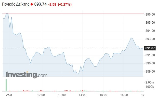 Πιο συγκεκριμένα, ο Γενικός Δείκτης σημείωσε μικρή πτώση κατά 0,27% και διαμορφώθηκε στις 893,74 μονάδες, χάνοντας περίπου 2,5 μονάδες σε σχέση με το κλείσιμο της Πέμπτης (896,12 μονάδες). Το τόξο των ημερήσιων διακυμάνσεων καθορίστηκε σε επτά μονάδες (από 888,57 έως 895,76 μονάδες), με τον τζίρο των συναλλαγών να περιορίζεται σε χαμηλά επίπεδα, μην υπερβαίνοντας τα 34 εκατ. ευρώ.
