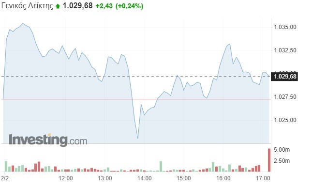 Πιο αναλυτικά, ο Γενικός Δείκτης σημείωσε οριακή άνοδο κατά 0,24% και διαμορφώθηκε στις 1.029,68 μονάδες, κερδίζοντας περίπου 2,5 μονάδες σε σχέση με το κλείσιμο της Τετάρτης (1.027,25 μονάδες). Το τόξο των ημερήσιων διακυμάνσεων καθορίστηκε σε 13 μονάδες (από 1.022,30 έως 1.035,54 μονάδες), με τον τζίρο των συναλλαγών να κυμαίνεται στα 131,6 εκατομμύρια ευρώ.