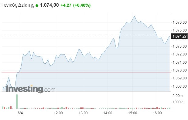 Πιο αναλυτικά, ο Γενικός Δείκτης σημείωσε άνοδο κατά 0,40% και διαμορφώθηκε στις 1.074,00 μονάδες, κερδίζοντας περίπου 4,5 μονάδες σε σχέση με το κλείσιμο της Τετάρτης (1.069,73 μονάδες). Το τόξο των ημερήσιων διακυμάνσεων καθορίστηκε σε οκτώ μονάδες (από 1.069,61 έως 1.077,03 μονάδες), με τον τζίρο των συναλλαγών να κυμαίνεται στα 45,2 εκατομμύρια ευρώ.