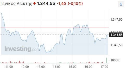 Πιο αναλυτικά, ο Γενικός Δείκτης σημείωσε ανεπαίσθητη πτώση κατά 0,10% και διαμορφώθηκε στις 1.344,55 μονάδες, χάνοντας περίπου 1,5 μονάδα σε σχέση με το κλείσιμο της Τρίτης (1.345,95 μονάδες). Το τόξο των ημερήσιων διακυμάνσεων καθορίστηκε σε εννέα μονάδες (από 1.340,62 έως 1.349,31 μονάδες), με τον τζίρο των συναλλαγών να κυμαίνεται στα 83 εκατ. ευρώ.