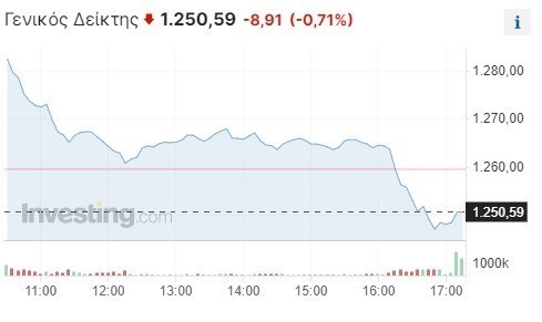 Πιο αναλυτικά, παρά το ισχυρό ξεκίνημα (έφθασε έως το +1,5%), ο Γενικός Δείκτης σημείωσε σημαντική πτώση κατά 0,71% και διαμορφώθηκε στις 1.250,59 μονάδες, χάνοντας σχεδόν εννέα μονάδες σε σχέση με το κλείσιμο της Παρασκευής (1.259,50 μονάδες). Το τόξο των ημερήσιων διακυμάνσεων καθορίστηκε σε 35 μονάδες (από 1.247,02 έως 1.282,65 μονάδες), με τον τζίρο των συναλλαγών να κυμαίνεται στα 138,3 εκατ. ευρώ.