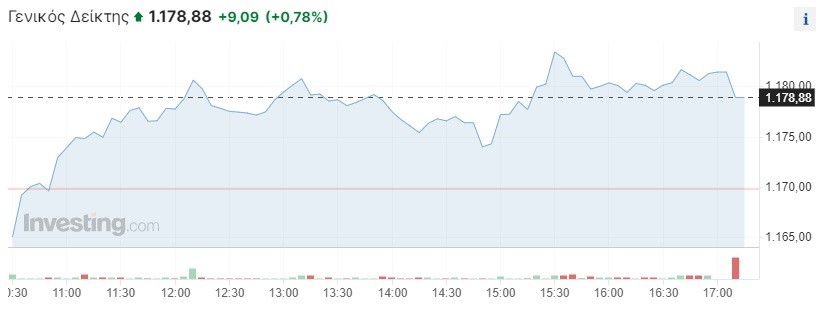 Πιο αναλυτικά, ο Γενικός Δείκτης σημείωσε άνοδο κατά 0,78% και διαμορφώθηκε στις 1.178,88 μονάδες, κερδίζοντας εννέα μονάδες σε σχέση με το κλείσιμο της Τρίτης (1.169,79 μονάδες). Το τόξο των ημερήσιων διακυμάνσεων καθορίστηκε σε 20 μονάδες (από 1.163,77 έως 1.183,57 μονάδες), με τον τζίρο των συναλλαγών να κυμαίνεται στα 74 εκατ. ευρώ.