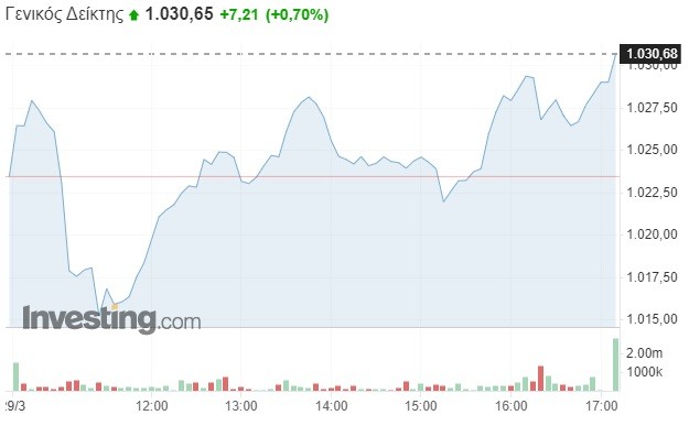 Πιο αναλυτικά, ο Γενικός Δείκτης σημείωσε ήπια άνοδο κατά 0,70% και διαμορφώθηκε στις 1.030,65 μονάδες, κερδίζοντας τουλάχιστον επτά μονάδες σχέση με το κλείσιμο της Τρίτης (1.023,44 μονάδες). Το τόξο των ημερήσιων διακυμάνσεων καθορίστηκε σε 17 μονάδες (από 1.014,84 έως 1.031,97 μονάδες), με τον τζίρο των συναλλαγών να κυμαίνεται στα 72,1 εκατομμύρια ευρώ.