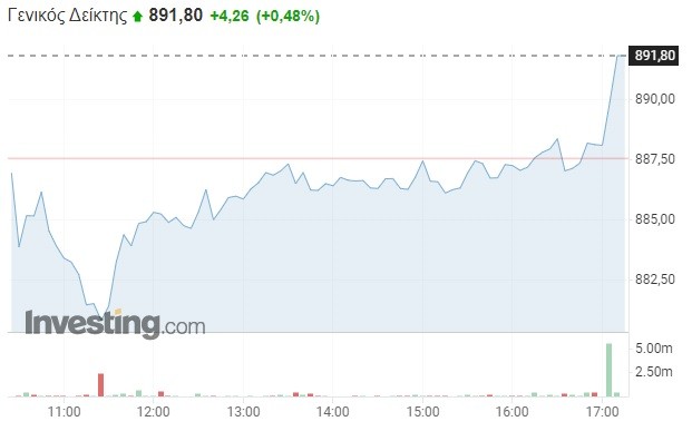 Πιο συγκεκριμένα, ο Γενικός Δείκτης σημείωσε ήπια άνοδο κατά 0,48% και διαμορφώθηκε στις 891,80 μονάδες, κερδίζοντας σχεδόν 4,5 μονάδες σε σχέση με το κλείσιμο της Τρίτης (887,54 μονάδες). Το τόξο των ημερήσιων διακυμάνσεων καθορίστηκε σε 11 μονάδες (από 880,73 έως 891,81 μονάδες), με τον τζίρο των συναλλαγών να φθάνει στα 75 εκατομμύρια ευρώ (μεγάλο μέρος διακινήθηκε μέσω πακέτων).