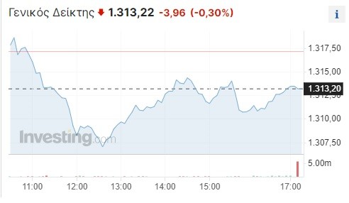 Πιο αναλυτικά, ο Γενικός Δείκτης σημείωσε ελεγχόμενη πτώση κατά 0,30% και διαμορφώθηκε στις 1.313,20 μονάδες, χάνοντας τέσσερις μονάδες σε σχέση με το κλείσιμο της Τετάρτης (1.317,18 μονάδες). Το τόξο των ημερήσιων διακυμάνσεων καθορίστηκε σε 11 μονάδες (από 1.307,01 έως 1.318,96 μονάδες), με τον τζίρο των συναλλαγών να κυμαίνεται στα 82,9 εκατ. ευρώ.