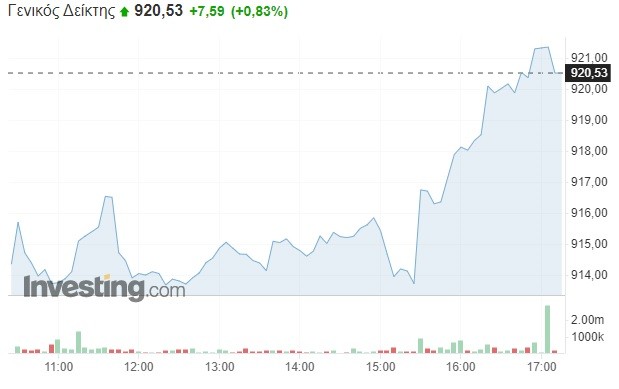 Στη ζώνη των 920 μονάδων επανήλθε το Χρηματιστήριο Αθηνών, εν μέσω του κλίματος ευφορίας που επικρατεί στις διεθνείς αγορές, μετά τα θετικά στοιχεία για τον αμερικανικό πληθωρισμό, τα οποία προλειαίνουν το έδαφος για μικρότερες αυξήσεις επιτοκίων από τις κεντρικές τράπεζες. Στο επίκεντρο της προσοχής τέθηκε κυρίως η μετοχή της Mytilineos, η οποία αναρριχήθηκε σε ακόμη ένα ιστορικό υψηλό, στον απόηχο της νέας επένδυσης της Fairfax.