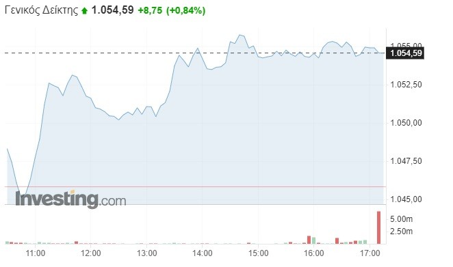 Πιο αναλυτικά, ο Γενικός Δείκτης σημείωσε άνοδο κατά 0,84% και διαμορφώθηκε στις 1.054,59 μονάδες, κερδίζοντας περίπου εννέα μονάδες σε σχέση με το κλείσιμο της Πέμπτης (1.045,84 μονάδες). Το τόξο των ημερήσιων διακυμάνσεων καθορίστηκε σε 12 μονάδες (από 1.044,80 έως 1.056,24 μονάδες), με τον τζίρο των συναλλαγών να κυμαίνεται στα 89,8 εκατομμύρια ευρώ.