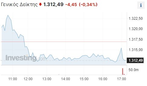 Πιο αναλυτικά, ο Γενικός Δείκτης σημείωσε οριακή πτώση κατά 0,34% και διαμορφώθηκε στις 1.312,49 μονάδες, χάνοντας περίπου 4,5 μονάδες σε σχέση με το κλείσιμο της Τετάρτης (1.316,94 μονάδες). Το τόξο των ημερήσιων διακυμάνσεων καθορίστηκε σε 12 μονάδες (από 1.311,73 έως 1.323,61 μονάδες), με την αξία των συναλλαγών να εκτινάσσεται στα 451,5 εκατ. ευρώ.