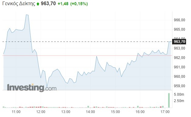 Πιο αναλυτικά, ο Γενικός Δείκτης σημείωσε ανεπαίσθητη άνοδο κατά 0,15% και διαμορφώθηκε στις 963,70 μονάδες, κερδίζοντας σχεδόν 1,5 μονάδα σε σχέση με το κλείσιμο της Τρίτης (962,22 μονάδες). Το τόξο των ημερήσιων διακυμάνσεων καθορίστηκε σε οκτώ μονάδες (από 958,68 έως 966,75 μονάδες), με τον τζίρο των συναλλαγών να κυμαίνεται σε 78 εκατομμύρια ευρώ.