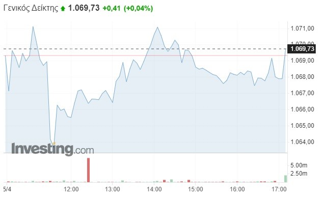 Πιο αναλυτικά, ο Γενικός Δείκτης σημείωσε ανεπαίσθητη άνοδο κατά 0,04% και διαμορφώθηκε στις 1.069,73 μονάδες, κερδίζοντας μόλις 0,4 μονάδα σε σχέση με το κλείσιμο της Τρίτης (1.069,32 μονάδες). Το τόξο των ημερήσιων διακυμάνσεων καθορίστηκε σε οκτώ μονάδες (από 1.063,65 έως 1.071,32 μονάδες), με τον τζίρο των συναλλαγών να κυμαίνεται στα 57,5 εκατομμύρια ευρώ.