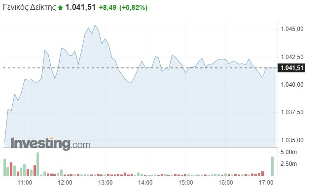 Πιο αναλυτικά, ο Γενικός Δείκτης σημείωσε αξιοσημείωτη άνοδο κατά 0,82% και διαμορφώθηκε στις 1.041,51 μονάδες, κερδίζοντας 8,5 μονάδες σε σχέση με το κλείσιμο της Δευτέρας (1.033,02 μονάδες). Το τόξο των ημερήσιων διακυμάνσεων καθορίστηκε σε 12 μονάδες (από 1.033,38 έως 1.045,63 μονάδες), με τον τζίρο των συναλλαγών να κυμαίνεται στα 120,7 εκατομμύρια ευρώ.