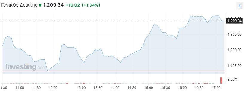 Πιο αναλυτικά, ο Γενικός Δείκτης σημείωσε αξιοσημείωτη άνοδο κατά 1,34% και διαμορφώθηκε στις 1.209,34 μονάδες, κερδίζοντας 16 μονάδες σε σχέση με το κλείσιμο της Πέμπτης (1.193,32 μονάδες). Το τόξο των ημερήσιων διακυμάνσεων καθορίστηκε σε 18 μονάδες (από 1.193,25 έως 1.211,47 μονάδες), με τον τζίρο των συναλλαγών να κυμαίνεται σε χαμηλά επίπεδα (71,8 εκατ. ευρώ).