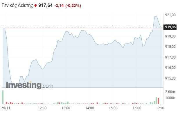 Πιο συγκεκριμένα, κατά τη διάρκεια της Παρασκευής, ο Γενικός Δείκτης σημείωσε οριακή πτώση κατά 0,23% και διαμορφώθηκε στις 917,64 μονάδες, χάνοντας δύο μονάδες σε σχέση με το κλείσιμο της Πέμπτης (919,78 μονάδες). Το τόξο των ημερήσιων διακυμάνσεων καθορίστηκε σε επτά μονάδες (από 914,27 έως 921,23 μονάδες), με τον τζίρο των συναλλαγών να κυμαίνεται στα 47 εκατομμύρια ευρώ.