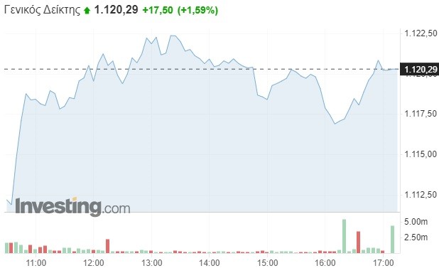 Πιο αναλυτικά, ο Γενικός Δείκτης σημείωσε αξιοσημείωτη άνοδο κατά 1,59% και διαμορφώθηκε στις 1.120,29 μονάδες, κερδίζοντας 17,5 μονάδες σε σχέση με το κλείσιμο της Πέμπτης (1.102,79 μονάδες). Το τόξο των ημερήσιων διακυμάνσεων καθορίστηκε σε 11 μονάδες (από 1.111,46 έως 1.122,88 μονάδες), με τον τζίρο των συναλλαγών να κυμαίνεται στα 132,8 εκατ. ευρώ.