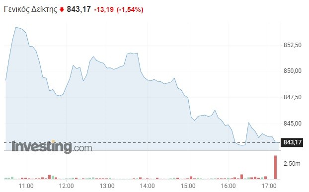 Πιο συγκεκριμένα, ο Γενικός Δείκτης σημείωσε αξιοσημείωτη πτώση κατά 1,54% και διαμορφώθηκε στις 843,17 μονάδες, χάνοντας 13 μονάδες σε σχέση με το κλείσιμο της Τετάρτης (856,36 μονάδες). Το τόξο των ημερήσιων διακυμάνσεων καθορίστηκε σε 12 μονάδες (από 842,70 έως 854,71 μονάδες), με τον τζίρο των συναλλαγών να κυμαίνεται στα 63,5 εκατ. ευρώ.