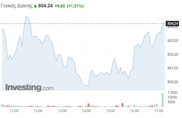 Πιο συγκεκριμένα, ο Γενικός Δείκτης σημείωσε αξιοσημείωτη άνοδο κατά 1,21% και διαμορφώθηκε στις 804,24 μονάδες, κερδίζοντας περισσότερες από εννέα μονάδες σε σχέση με το κλείσιμο της Παρασκευής (794,62 μονάδες). Το τόξο των ημερήσιων διακυμάνσεων καθορίστηκε σε έξι μονάδες (από 798,14 έως 804,78 μονάδες), με τον τζίρο των συναλλαγών να μην υπερβαίνει τα 30 εκατ. ευρώ. Για την ακρίβεια έφθασε τα 29 εκατ. ευρώ.