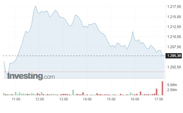 Πιο αναλυτικά, ο Γενικός Δείκτης σημείωσε ήπια άνοδο κατά 0,33% και διαμορφώθηκε στις 1.205,30 μονάδες, κερδίζοντας τέσσερις μονάδες σε σχέση με το κλείσιμο της Δευτέρας (1.201,32 μονάδες). Το τόξο των ημερήσιων διακυμάνσεων καθορίστηκε σε 20 μονάδες (από 1.199,80 έως 1.219,07 μονάδες), με τον τζίρο των συναλλαγών να κυμαίνεται στα 220,3 εκατ. ευρώ.