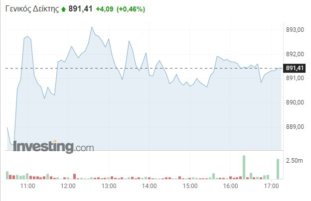 Πιο συγκεκριμένα, ο Γενικός Δείκτης κατέγραψε επιφυλακτική άνοδο κατά 0,46% και ενισχύθηκε στις 891,41 μονάδες, κερδίζοντας μόλις τέσσερις μονάδες σε σχέση με το κλείσιμο της Πέμπτης (887,32 μονάδες). Το τόξο των ημερήσιων διακυμάνσεων διαμορφώθηκε στις πέντε μονάδες (από 888,09 έως 893,19 μονάδες), με τον τζίρο των συναλλαγών να υπερβαίνει τα 83 εκατομμύρια ευρώ.