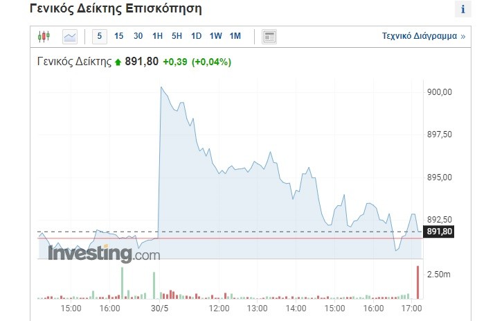 Ανεπαίσθητες μεταβολές εμφάνισε σήμερα το Χρηματιστήριο Αθηνών, το οποίο δεν κατάφερε να «συντηρήσει» την πρωινή ανοδική ορμή, χάνοντας ενδοσυνεδριακά έως και 10 μονάδες. Παρ’ όλα αυτά, ο βασικός δείκτης «διέσωσε» το πρόσημο και έκλεισε σε θετικό έδαφος για 5η διαδοχική συνεδρίαση. Όσον αφορά την προσπάθεια διάσπασης των 900 μονάδων, βέβαια, αποδεικνύεται αρκετά δύσκολη υπόθεση, καθώς τα ανοδικά περιθώρια φαίνονται περιορισμένα.