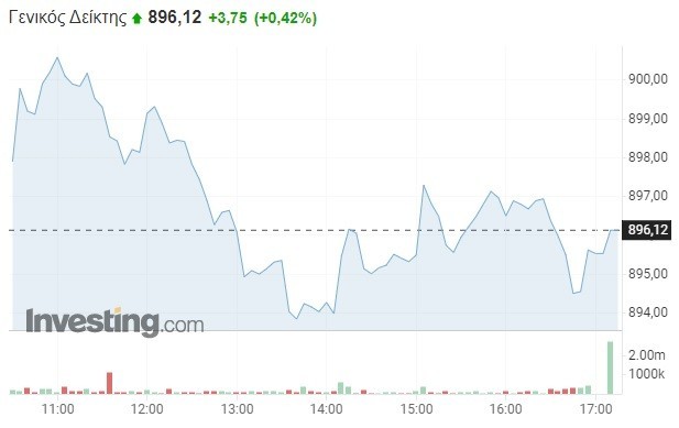 Πιο συγκεκριμένα, ο Γενικός Δείκτης σημείωσε μικρή αύξηση κατά 0,42% και διαμορφώθηκε στις 896,12 μονάδες, κερδίζοντας σχεδόν τέσσερις μονάδες σε σχέση με το κλείσιμο της Τετάρτης. Το τόξο των ημερήσιων διακυμάνσεων καθορίστηκε σε επτά μονάδες (από 893,75 έως 900,98 μονάδες), με τον τζίρο των συναλλαγών να κυμαίνεται κοντά στα 59 εκατ. ευρώ.