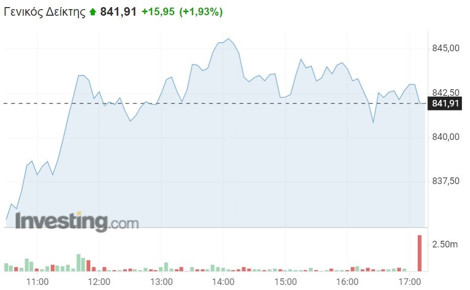 Πιο συγκεκριμένα, ο Γενικός Δείκτης σημείωσε αισθητή άνοδο κατά 1,93% και διαμορφώθηκε στις 841,91 μονάδες, κερδίζοντας σχεδόν 16 μονάδες σε σχέση με το κλείσιμο της Πέμπτης (825,96 μονάδες). Το τόξο των ημερήσιων διακυμάνσεων καθορίστηκε σε 14 μονάδες (από 832,07 έως 846,04 μονάδες), με τον τζίρο των συναλλαγών να κυμαίνεται κοντά στα 70 εκατομμύρια ευρώ.