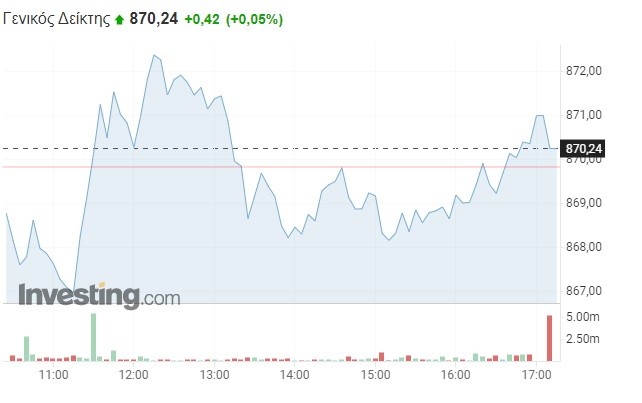 Πιο συγκεκριμένα, ο Γενικός Δείκτης σημείωσε ανεπαίσθητη άνοδο κατά 0,05% και διαμορφώθηκε στις 870,24 μονάδες, κερδίζοντας μόλις μισή μονάδα σε σχέση με το κλείσιμο της Τρίτης (869,82 μονάδες). Το τόξο των ημερήσιων διακυμάνσεων καθορίστηκε σε έξι μονάδες (από 866,37 έως 872,51 μονάδες), με τον τζίρο των συναλλαγών να κυμαίνεται σε σχετικά υψηλά επίπεδα, φθάνοντας κοντά στα 73 εκατ. ευρώ.