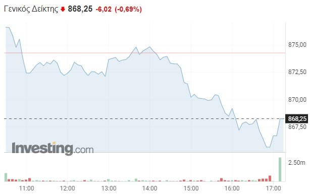 Πιο συγκεκριμένα, κατά τη διάρκεια της Τρίτης, ο Γενικός Δείκτης σημείωσε πτώση κατά 0,69% και διαμορφώθηκε στις 868,25 μονάδες, χάνοντας έξι μονάδες σε σχέση με το κλείσιμο της Δευτέρας (874,27 μονάδες). Το τόξο των ημερήσιων διακυμάνσεων καθορίστηκε σε 12 μονάδες (από 865,45 έως 877,03 μονάδες), με τον τζίρο των συναλλαγών να κυμαίνεται στα 54 εκατομμύρια ευρώ.