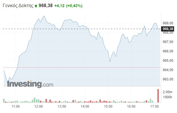 Πιο αναλυτικά, παρά την ενδοσυνεδριακή μεταβλητότητα, ο Γενικός Δείκτης σημείωσε ήπια άνοδο κατά 0,43% και διαμορφώθηκε στις 968,38 μονάδες, κερδίζοντας τέσσερις μονάδες σε σχέση με το κλείσιμο της Πέμπτης (964,26 μονάδες). Το τόξο των ημερήσιων διακυμάνσεων καθορίστηκε σε επτά μονάδες (από 962,51 έως 969,80 μονάδες), με τον τζίρο των συναλλαγών να κυμαίνεται σχεδόν στα 85,5 εκατομμύρια ευρώ.