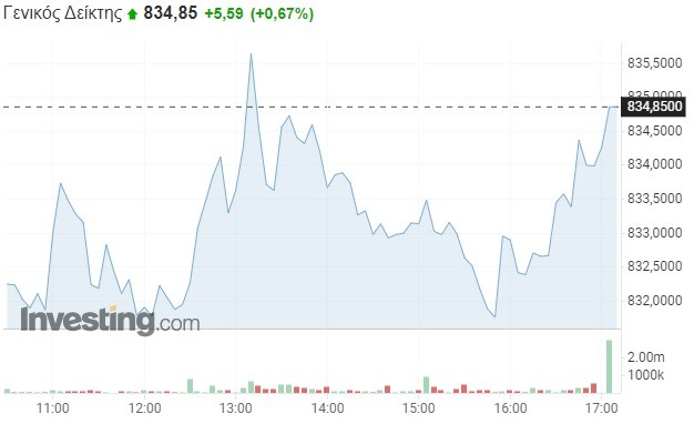 Πιο συγκεκριμένα, ο Γενικός Δείκτης σημείωσε συγκρατημένη άνοδο κατά 0,67% και διαμορφώθηκε στις 834,85 μονάδες, κερδίζοντας 5,5 μονάδες σε σχέση με το κλείσιμο της Τρίτης (829,26 μονάδες). Το τόξο των ημερήσιων διακυμάνσεων καθορίστηκε σε μόλις τέσσερις μονάδες (από 831,50 έως 835,65 μονάδες), με τον τζίρο των συναλλαγών να μην υπερβαίνει τα 40 εκατ. ευρώ -δείγμα της επενδυτικής ένδειας.