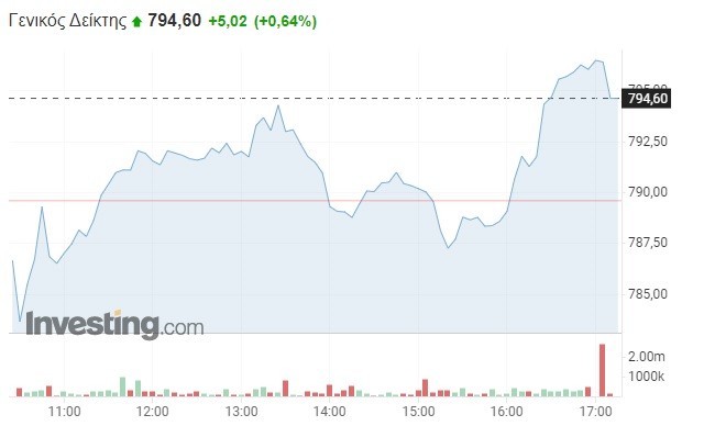 Πιο συγκεκριμένα, ο Γενικός Δείκτης σημείωσε άνοδο κατά 0,64% και ενισχύθηκε στις 794,60 μονάδες, κερδίζοντας πέντε μονάδες σε σχέση με το κλείσιμο της Δευτέρας (789,58 μονάδες). Το τόξο των ημερήσιων διακυμάνσεων καθορίστηκε σε 13 μονάδες (από 783,52 έως 796,63 μονάδες), με τον τζίρο των συναλλαγών να κυμαίνεται σε μόλις 50 εκατομμύρια ευρώ -δείγμα της… κακής «ποιότητας» της συνεδρίασης.