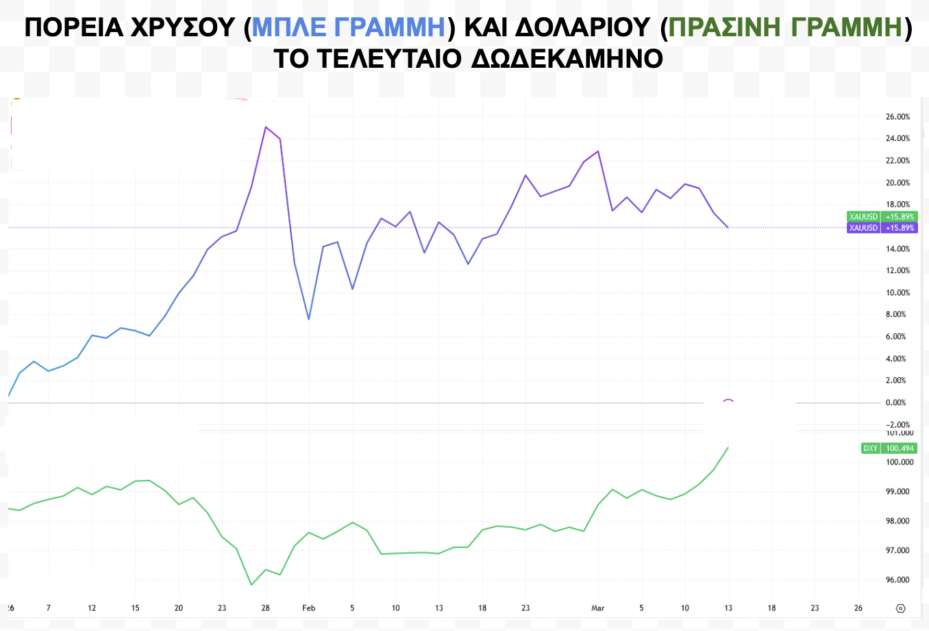 Το διάγραμμα της πορείας χρυσού και του σύνθετου δείκτη ισοτιμίας του δολαρίου (Dollar Index) τους τελευταίους 12 μήνες αποτυπώνει καθαρά αυτή τη δυναμική: ο χρυσός διατηρεί ισχυρά κέρδη, ενώ ο δείκτης του δολαρίου παραμένει υποτονικός μέχρι τις αρχές Μαρτίου, οπότε αρχίζει να αντιδρά ανοδικά — ακριβώς την περίοδο της κλιμάκωσης στο Ιράν.