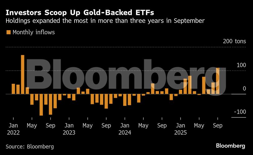 Όπως επισημαίνει το Bloomberg, οι επενδυτές αναζητούν προστασία από πιθανές διαταραχές της αγοράς μετά το αδιέξοδο χρηματοδότησης της κυβέρνησης στην Ουάσιγκτον. Η έναρξη του κύκλου νομισματικής χαλάρωσης της Fed έχει επίσης αποτελέσει «ευλογία» για το χρυσό, ο οποίος δεν αποδίδει τόκους. Οι επενδυτές ανταποκρίθηκαν συσσωρεύοντας κεφάλαια σε διαπραγματεύσιμα αμοιβαία κεφάλαια, με τα ETF που υποστηρίζονται από τον χρυσό να σημειώνουν τη μεγαλύτερη μηνιαία εισροή κεφαλαίων εδώ και περισσότερο από τρία χρόνια τον Σεπτέμβριο.