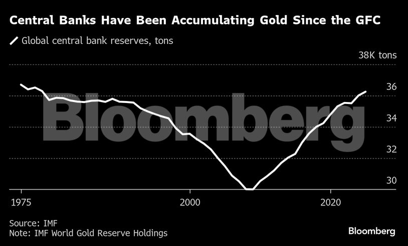 Οι κεντρικές τράπεζες υπήρξαν βασικός μοχλός της ανόδου του χρυσού, καθώς μετατράπηκαν από καθαροί πωλητές σε καθαρούς αγοραστές μετά την παγκόσμια χρηματοπιστωτική κρίση. Ο ρυθμός των αγορών διπλασιάστηκε μετά την απόφαση των ΗΠΑ και των συμμάχων τους να παγώσουν τα συναλλαγματικά αποθέματα της Ρωσίας το 2022, μετά την εισβολή στην Ουκρανία. Αυτό ώθησε πολλές κεντρικές τράπεζες να εξετάσουν το ενδεχόμενο διαφοροποίησης, ενώ ο πληθωρισμός και οι εικασίες ότι η αμερικανική κυβέρνηση θα αντιμετώπιζε τους ξένους πιστωτές λιγότερο ευνοϊκά ανέδειξαν περαιτέρω την ελκυστικότητα του χρυσού για τους υπεύθυνους χάραξης πολιτικής.
