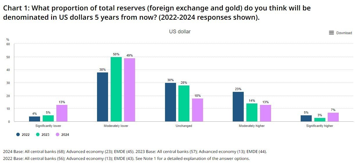 Το 56% των προηγμένων οικονομιών εκτιμά πως το μερίδιο του δολαρίου στα παγκόσμια αποθέματα θα συνεχίσει να συρρικνώνεται συνεχώς μέσα στην επόμενη πενταετία, ένα ποσοστό κατά δέκα(!) μονάδες μεγαλύτερο σε σχέση με πέρυσι. Για τις αναπτυσσόμενες οικονομίες το ποσοστό αυτό είναι ακόμη μεγαλύτερο αγγίζοντας το 64%.